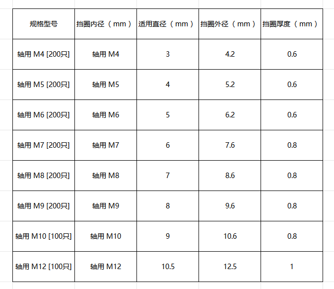 规格范围:支持轴径与挡圈线径规格定制