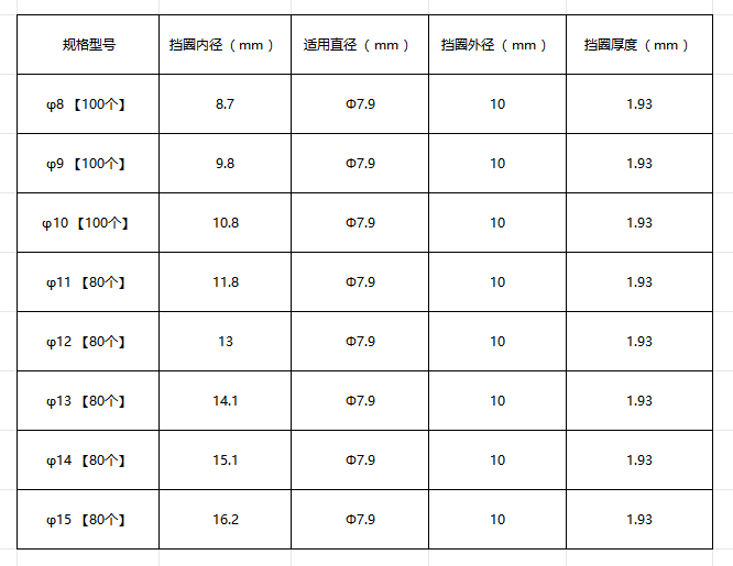 标准号:GB/T 893.1 性能等级:B级 材质:304不锈钢 表面处理:洗白(本色) 规格范围:支持孔径与挡圈线径规格定制...
