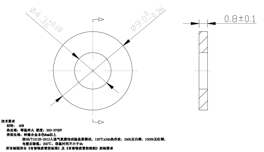本品为符合GB/T 97.1-2002标准的A级平垫圈,公称规格M4.3。采用45#钢制造,表面采用高性能锌镍合金镀层,厚度达8μm以上。产品具有精确的尺寸精度和卓越的耐腐蚀性能,专为汽车等对可靠性要求高的领域设计。
