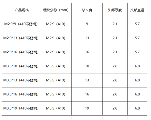 产品形式:沉头、十字槽、燕尾自攻螺纹