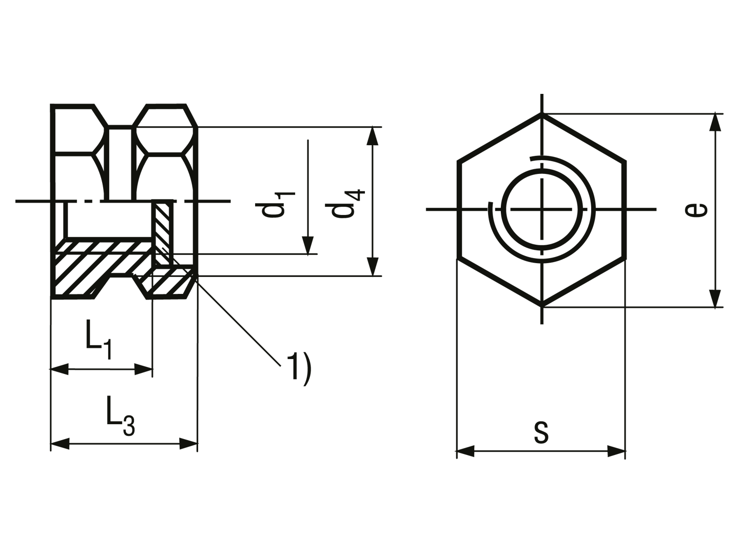 嵌入式螺纹衬套 E型 六角无凸肩, 带通孔螺纹, 用