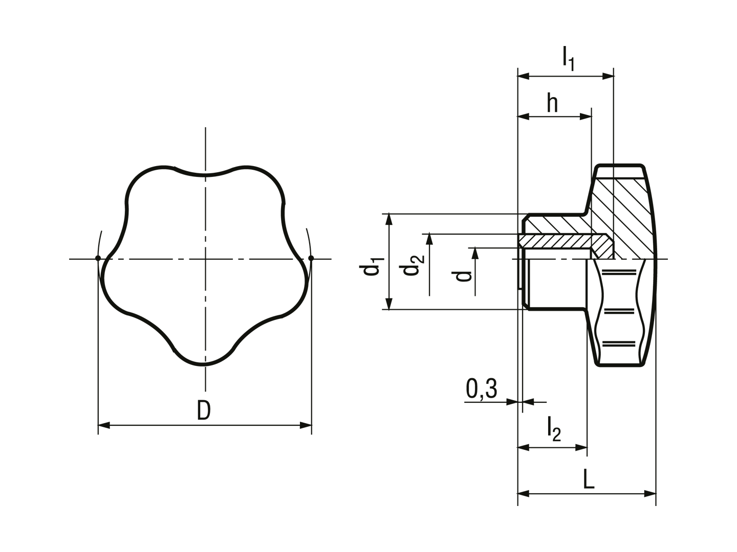 星型旋钮 金属崁入孔 铜衬套, 盲孔内螺纹