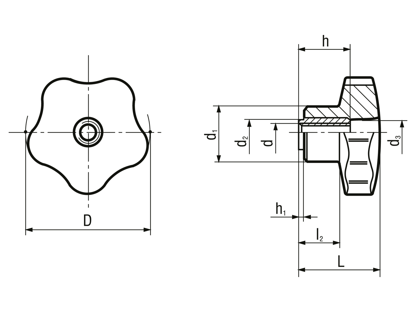 星型旋钮帽 短型,安装孔碳钢染黑,攻通孔螺纹