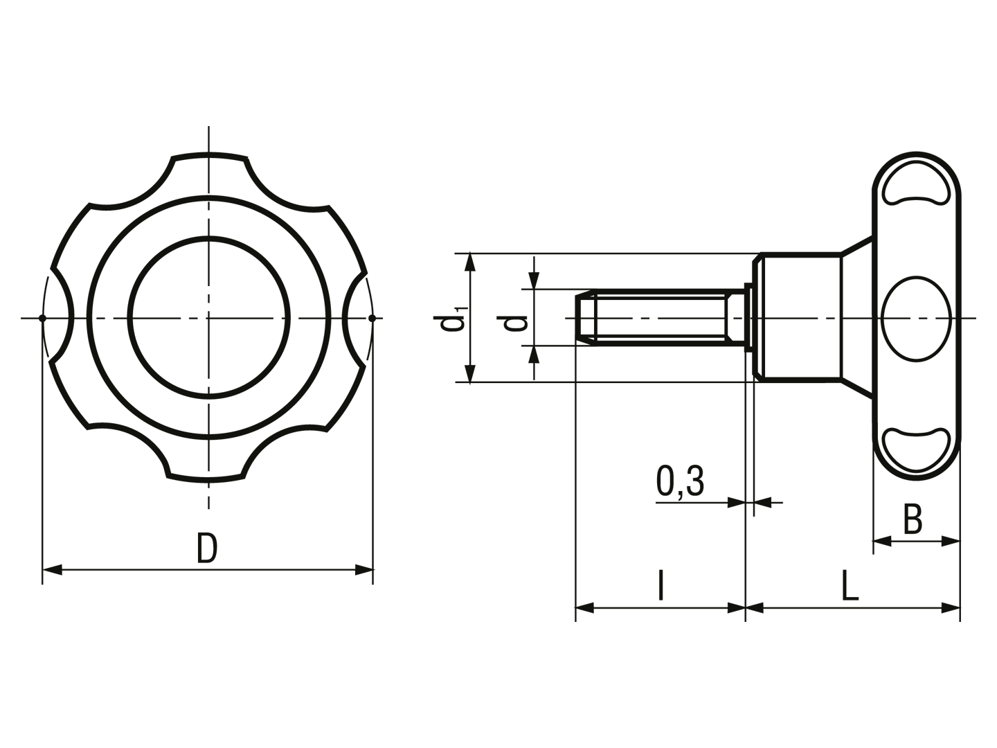 六瓣旋钮帽 金属崁入孔 铜衬套, 盲孔内螺纹