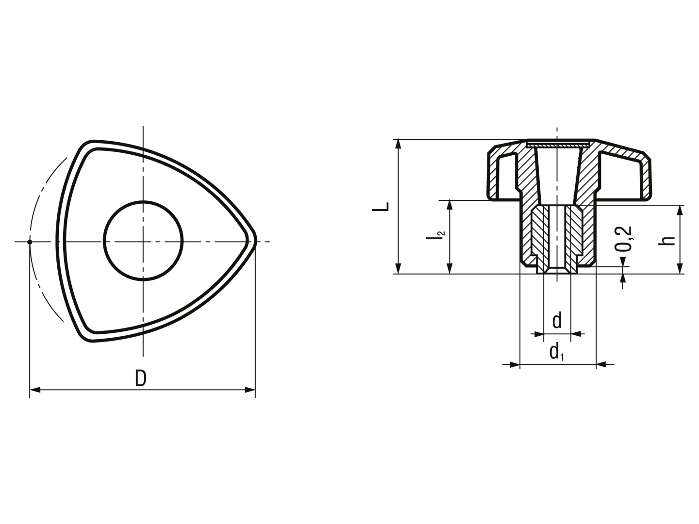> 三角形旋钮螺帽 铝材中心盖,铜质通孔内螺纹