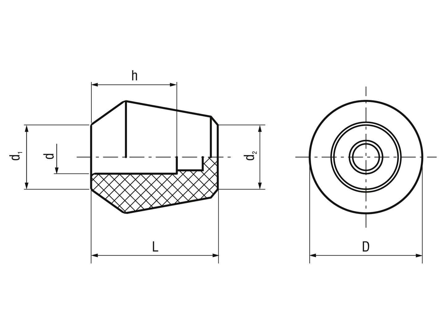 > 圆锥型把手头 压入方式装配于公差 h9 轴棒上