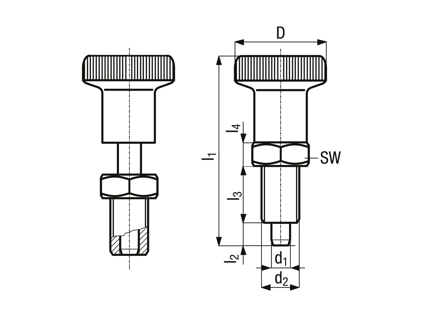 分割定位柱 无卡锁 带公制细牙, 无六角凸缘1