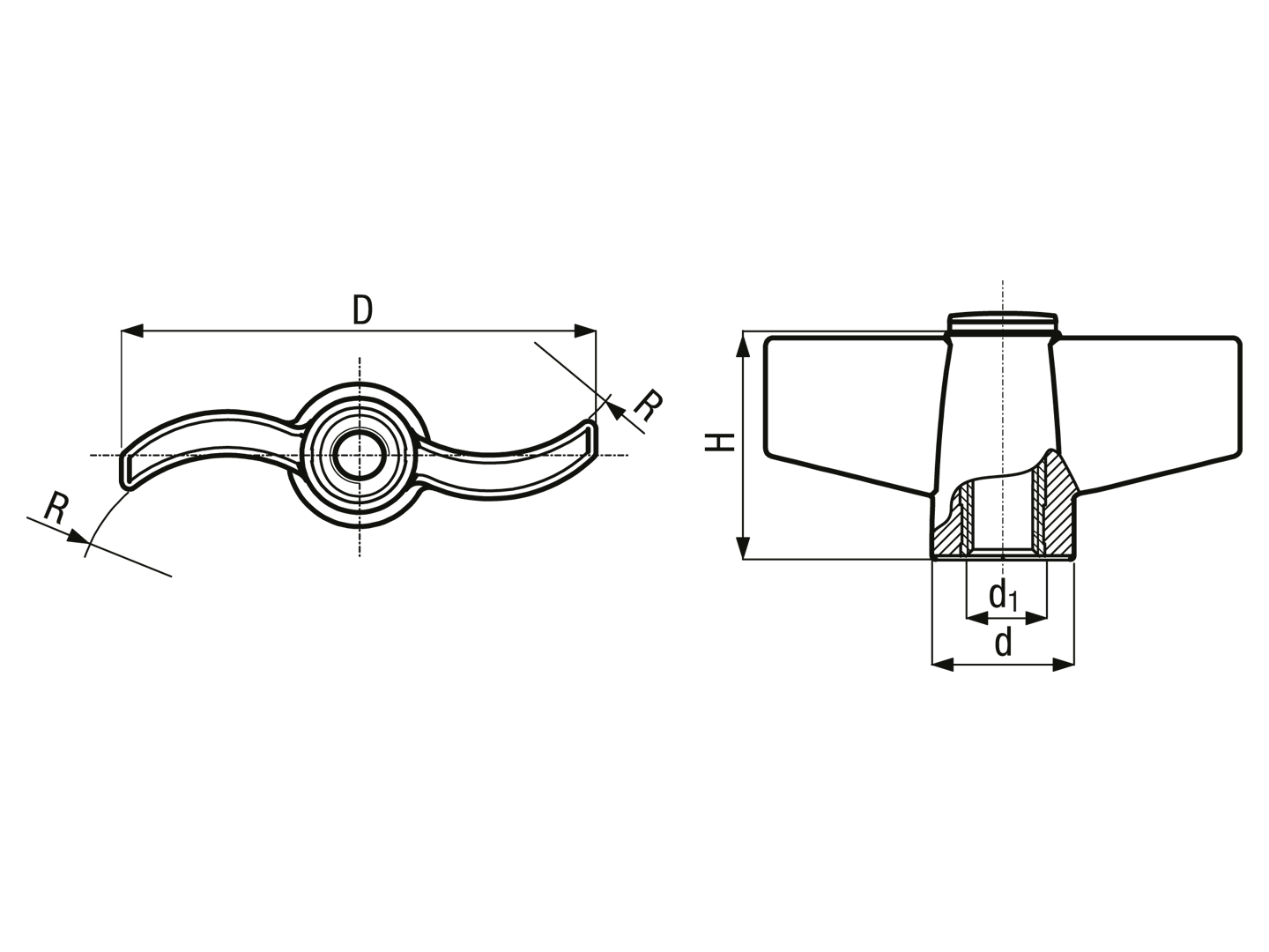翼型旋钮螺帽 带金属轮毂和通孔内螺纹