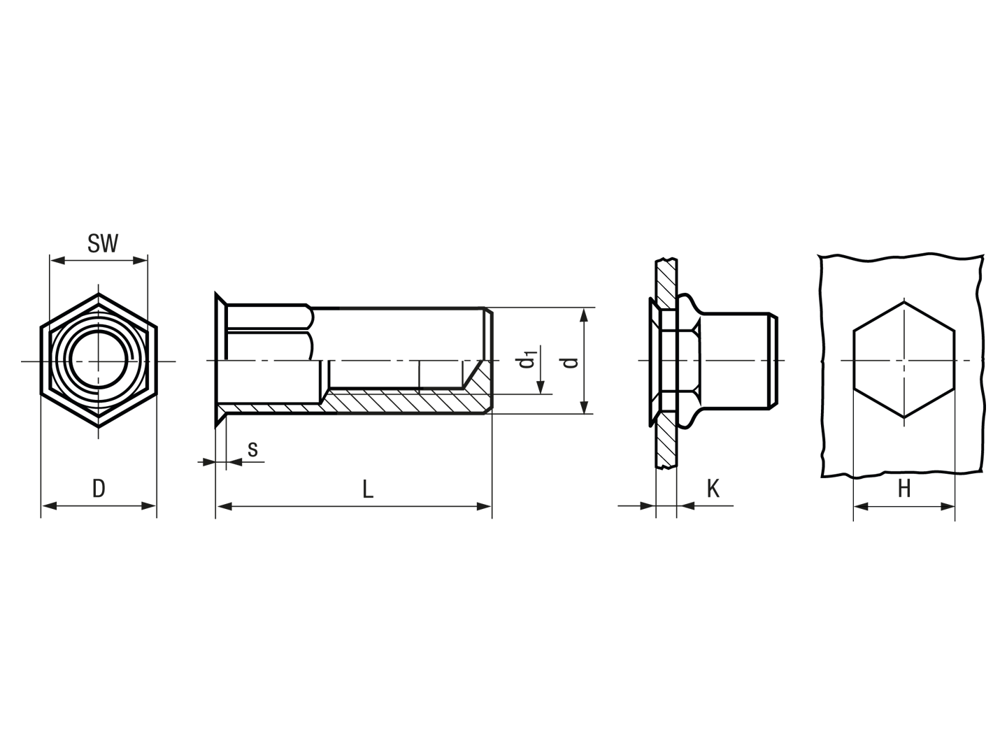 拉帽 小埋头, 半六角杆径, 通孔型