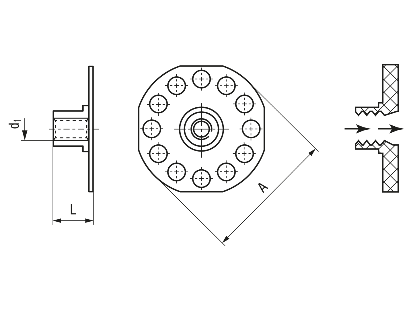 > 内螺纹套管压焊 八角形圆头 Ø 38 mm 通孔型